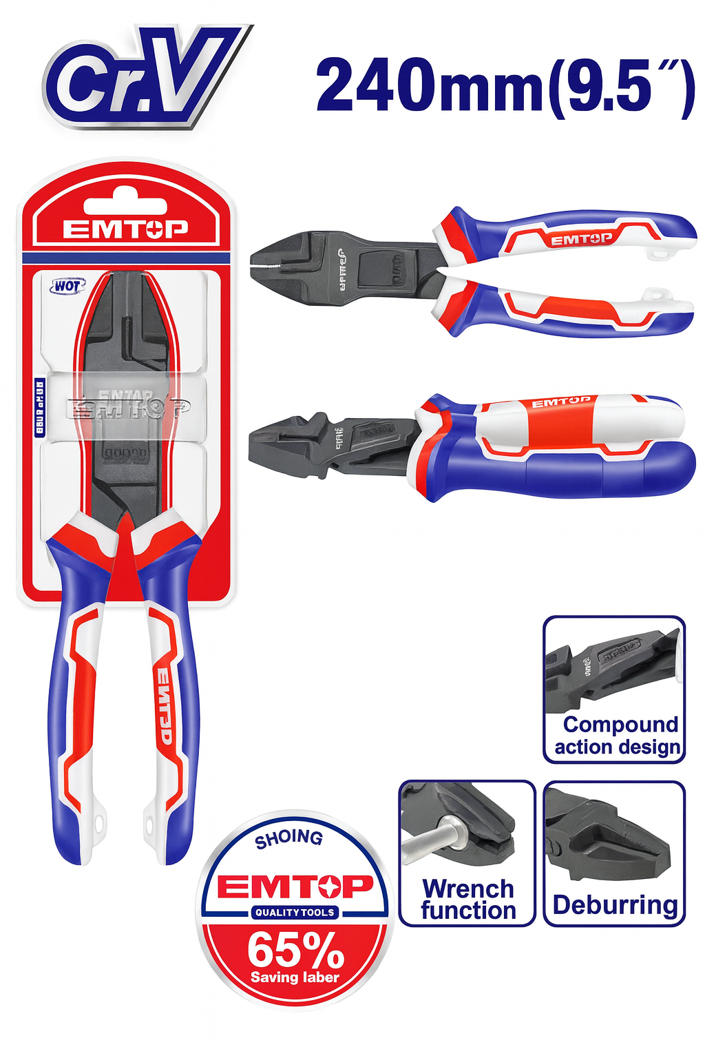 Alicate combinado de acción compuesta, diseñado para ofrecer hasta un 65% de ahorro de esfuerzo comparado con pinzas convencionales. Su sistema mecánico multiplica la fuerza aplicada, facilitando el corte y la sujeción de materiales duros. Fabricado en acero cromo-vanadio (Cr-V) estafa recubrimiento de teflón, garantiza gran durabilidad, resistencia a la corrosión y excelente rendimiento. el mango tricolor de TPR Brinda un agarre firme, cómodo y antideslizante para uso prolongado.