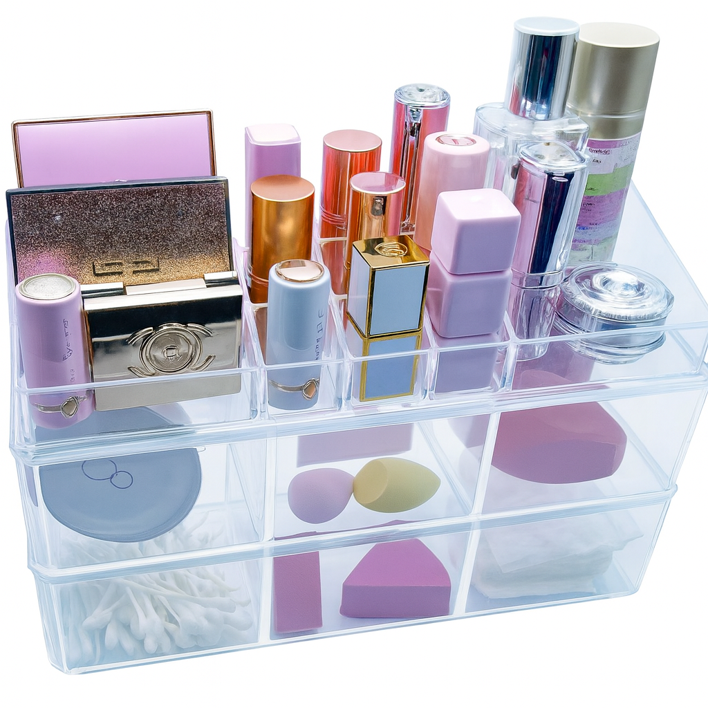 Caja organizadora plástica para maquillaje, ideal para mantener tus cosméticos ordenados, visibles y listos para usar. Su diseño práctico ayuda a ahorrar espacio en tocador, baño o escritorio.