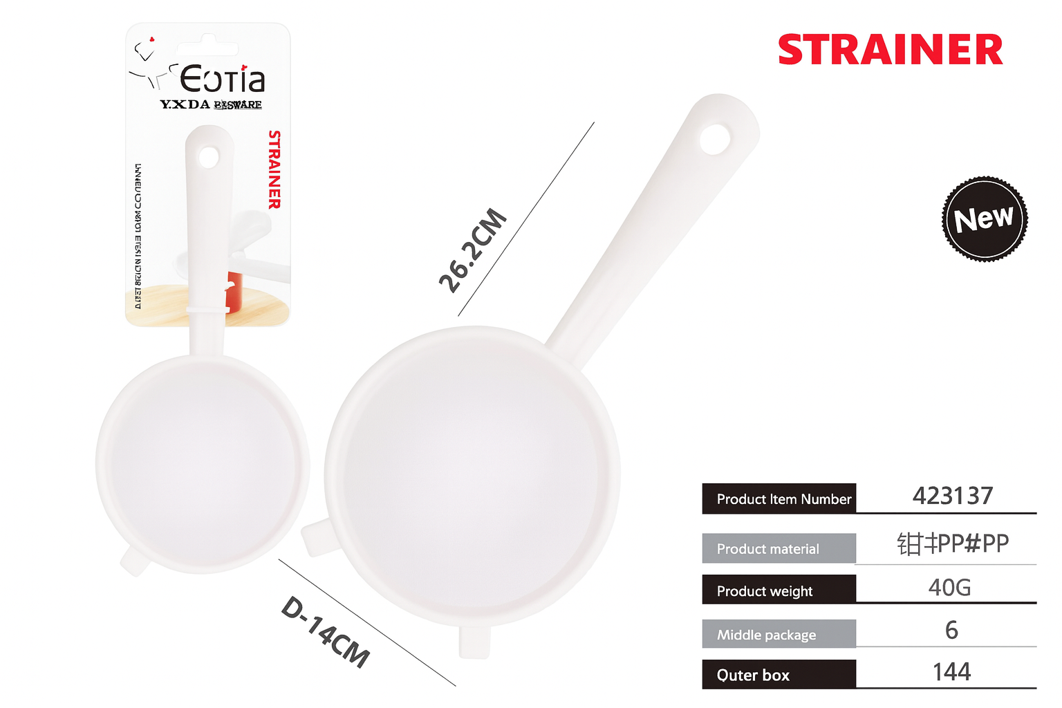 Fabricado con plástico resistente y libre de BPA, es duradero, fácil de manipular y sencillo de limpiar.. Su mango ergonómico garantiza un agarre firme y cómodo, mientras que su malla plastica fina permite un colado eficiente sin residuos. Perfecto para el hogar, cocinas pequeñas o uso profesional ligero.