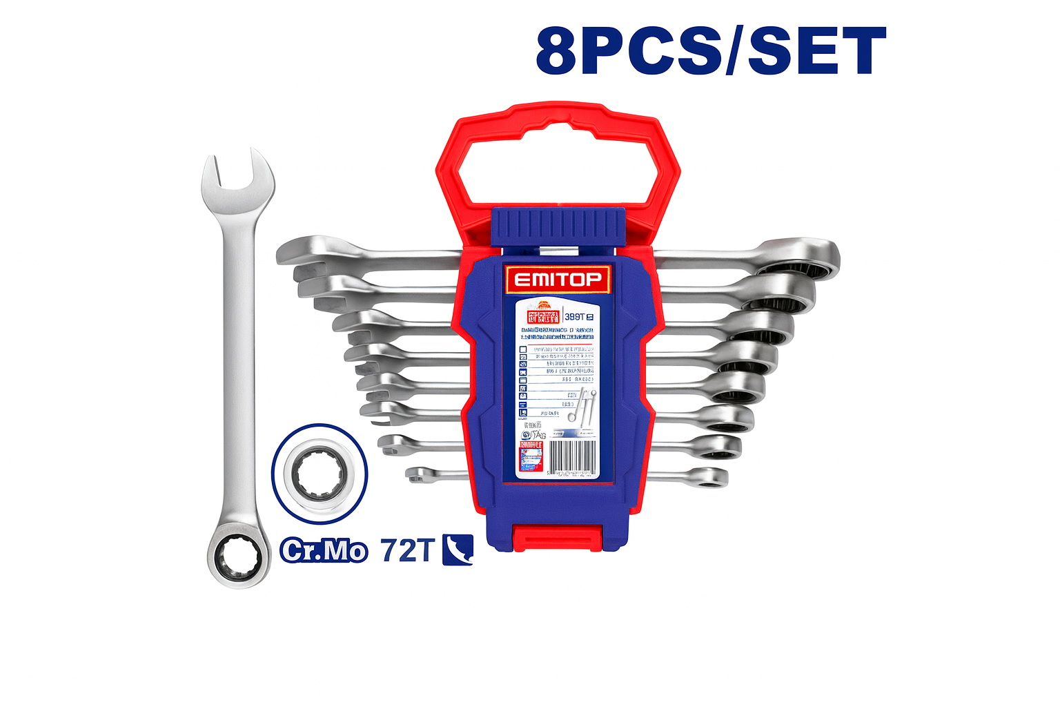 Juego de llaves combinadas con matraca de 8 piezas (8–19 mm) Cr-V pulido
