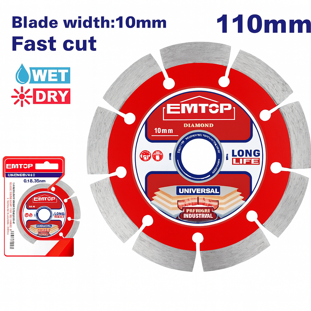 Disco diamantado EMTOP seco 110 mm x 20 mm para corte de concreto, ladrillo y piedra