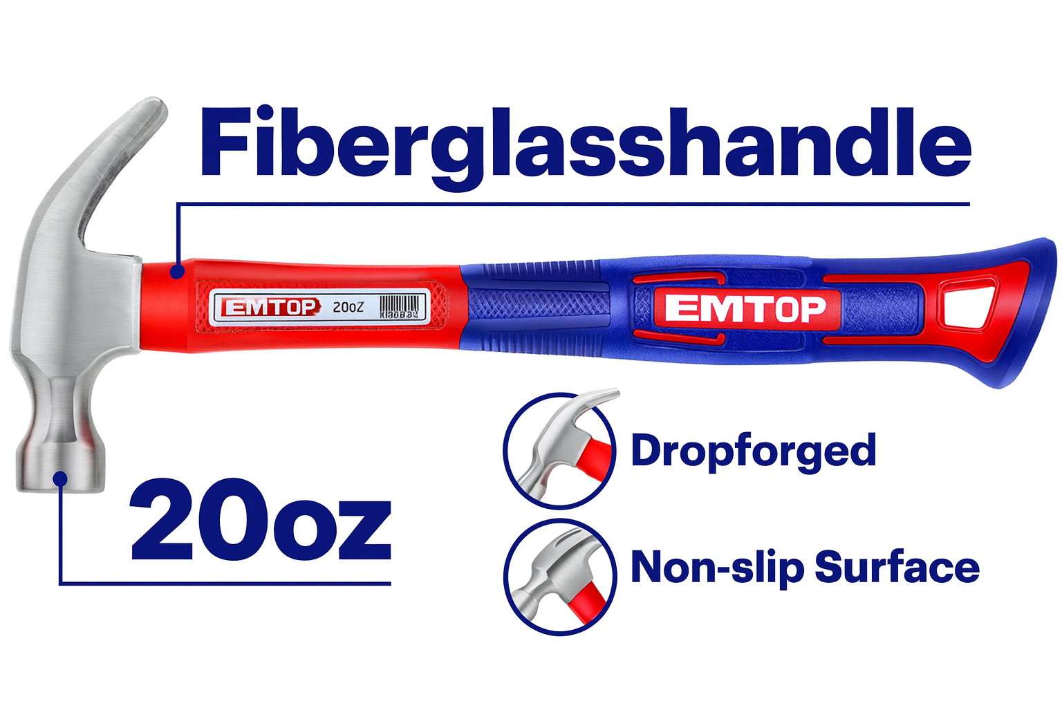 Martillo de uña de 20 oz (560 g) con mango de fibra de vidrio antideslizante y cabeza forjada en acero al carbono 45#