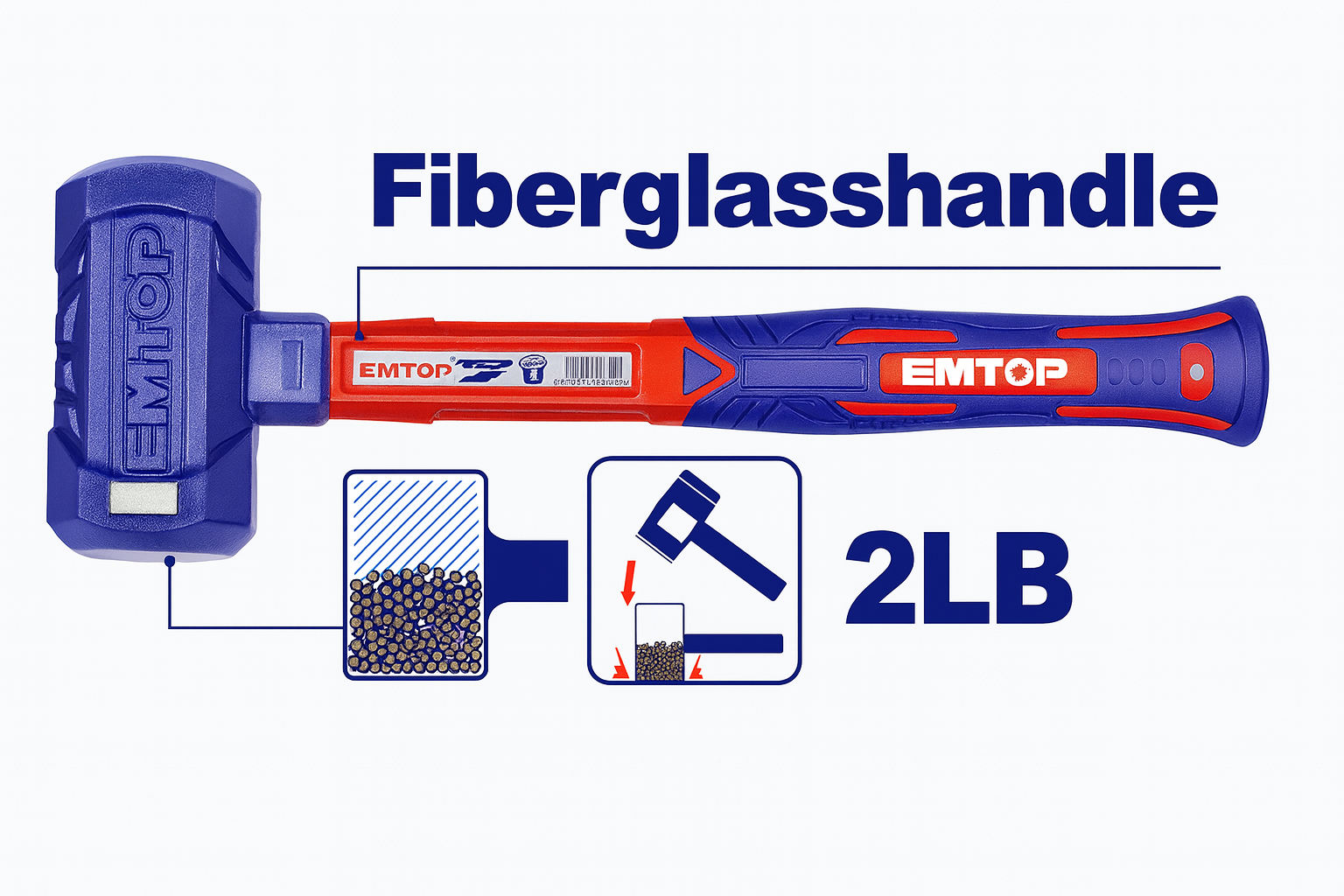 • Mazo antirrebote de 2 lb con caras plásticas y mango de fibra de vidrio