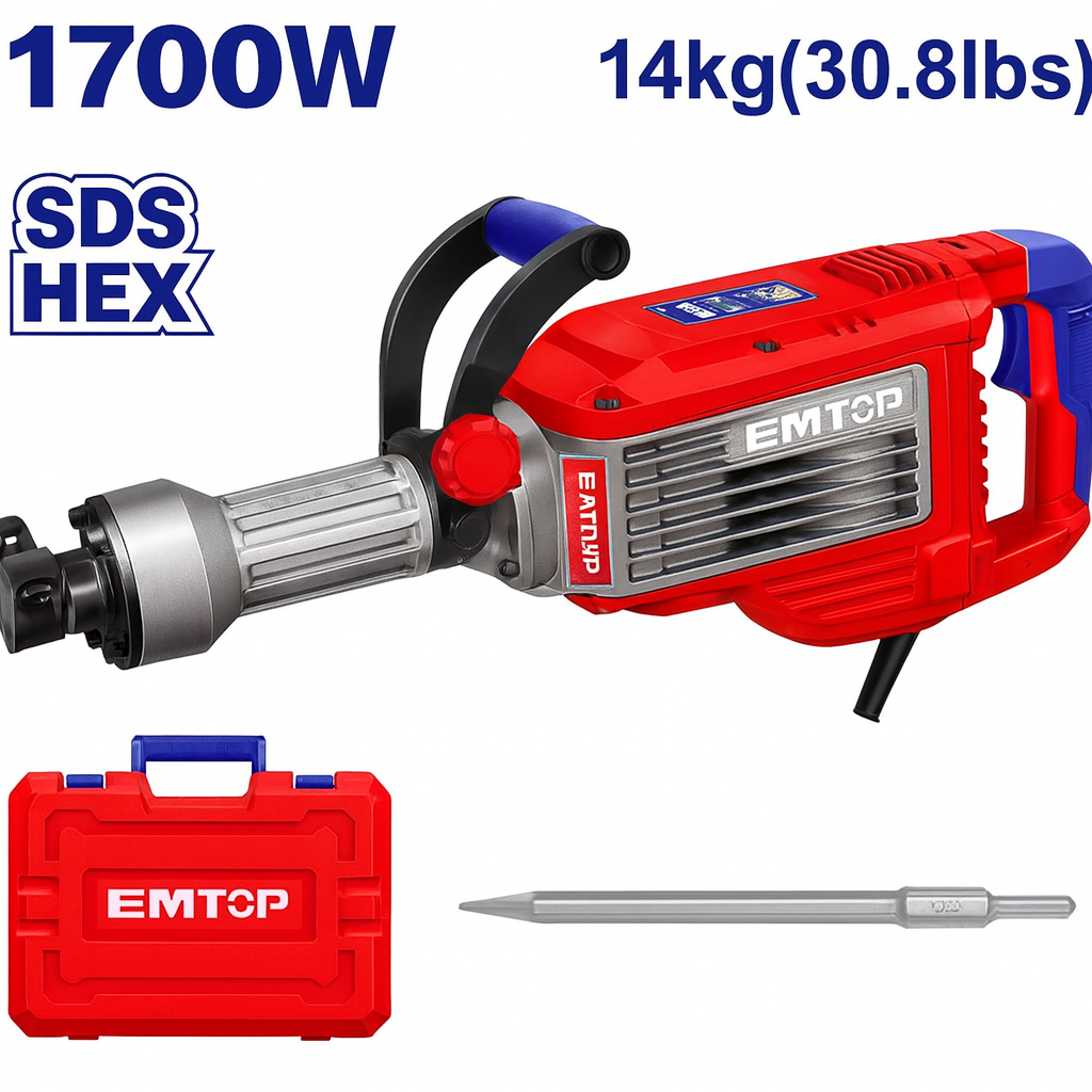 Martillo demoledor eléctrico de 1700 vatios estafa gran fuerza de impacto (50 julios), ideal para demoliciones pesadas en concreto, piedra y materiales duros. Su potente mecanismo de 1900 golpes por minuto (bpm) Garantiza la máxima eficiencia y rapidez en cada tarea. Equipado con sistema de encastre HEX para un cambio de cincel rápido y seguro, y diseñado con materiales resistentes para un uso prolongado.