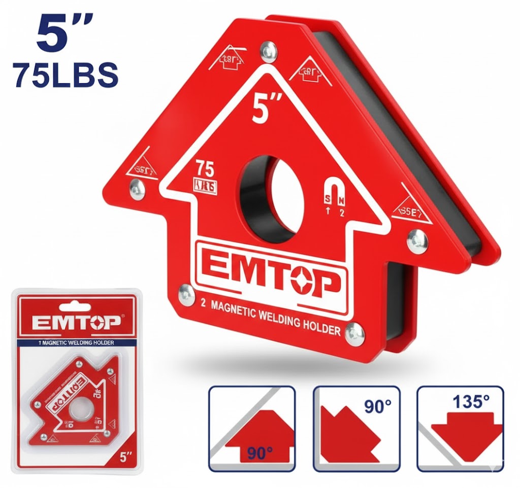 Soporte magnético de alta potencia y gran tamaño, diseñado para sujetar, alinear y posicionar piezas metálicas durante trabajos de soldadura, ensamblaje o fabricación industrial. Su estructura de acero resistente y su imán de gran fuerza (75 lb) garantizan una sujeción firme, estable y segura, permitiendo trabajar con precisión en distintos ángulos.