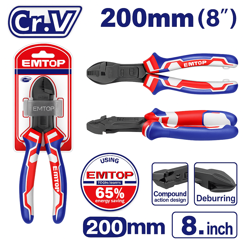 Alicate de corte diagonal con mecanismo de acción compuesto, diseñado para reducir el esfuerzo hasta en un 65% comparado con las pinzas tradicionales. Ideal para cortar cables, alambres y materiales duros con facilidad y precisión. Fabricado en acero cromo-vanadio (Cr-V) estafa recubrimiento de teflón, ofrece alta resistencia, durabilidad y protección contra la corrosión. Su mango tricolor de TPR Brinda un agarre fuerte, cómodo y antideslizante para mayor control.