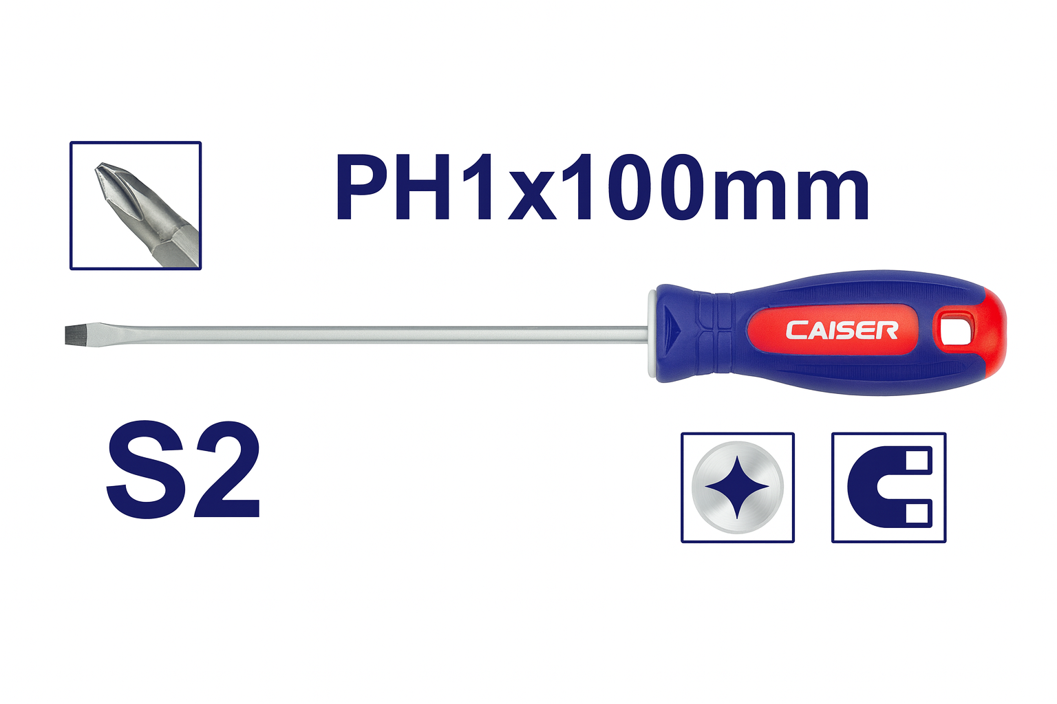 Desarmador de cruz de alta precision y resistencia, ideal para trabajos eléctricos, mecánicos o de mantenimiento general. Fabricado en acero industrial S2, ofrece excelente durabilidad y torque. Su Vástago redondo de 5 mm de diámetro. proporciona estabilidad durante el uso, mientras que su mango ergonómico Garantiza un agarre cómodo y seguro.