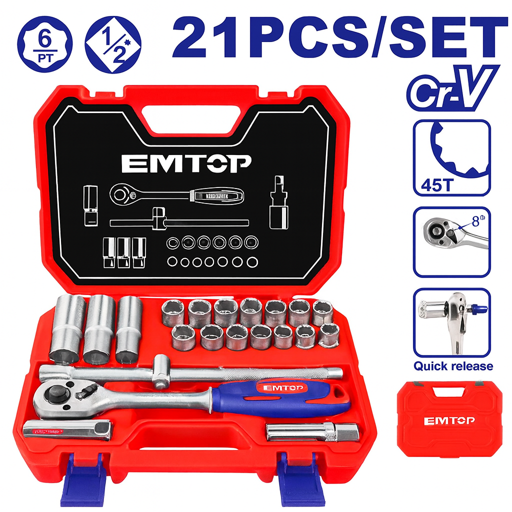 • Juego de copas 1/2" de 21 piezas Cr-V con maneral de carraca y extensión de 10"