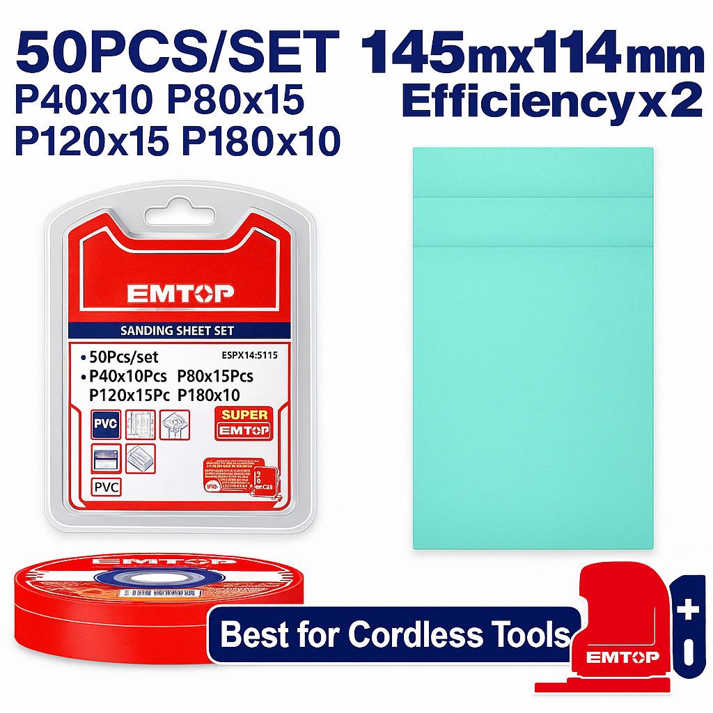 el set de hojas de lija EMTOP ESPR145115 ofrece una solución completa y versátil para lijado y acabado en múltiples superficies, incluyendo madera, metal, pintura, plástico, piedra y vidrio. Fabricadas con abrasivos de alta calidad, garantizan Rendimiento uniforme, durabilidad y resultados profesionales..