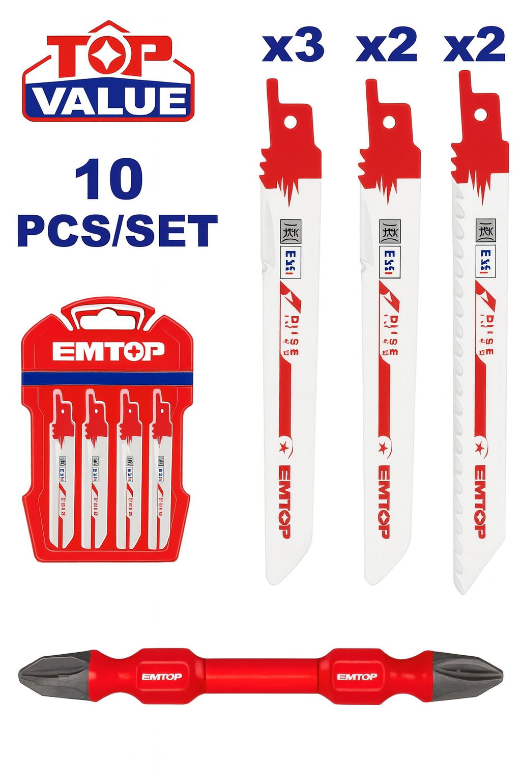 • Set de hojas para sierra sable EMTOP 10 piezas Bi-Metal para madera con clavos y metal