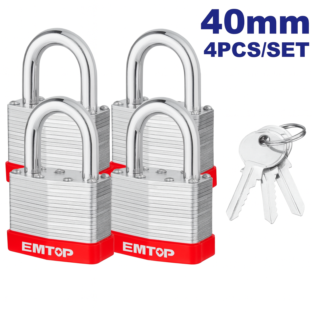 Juego de candados laminados 40 mm (4 piezas con llave igual) – cuerpo de acero niquelado y cilindro de latón