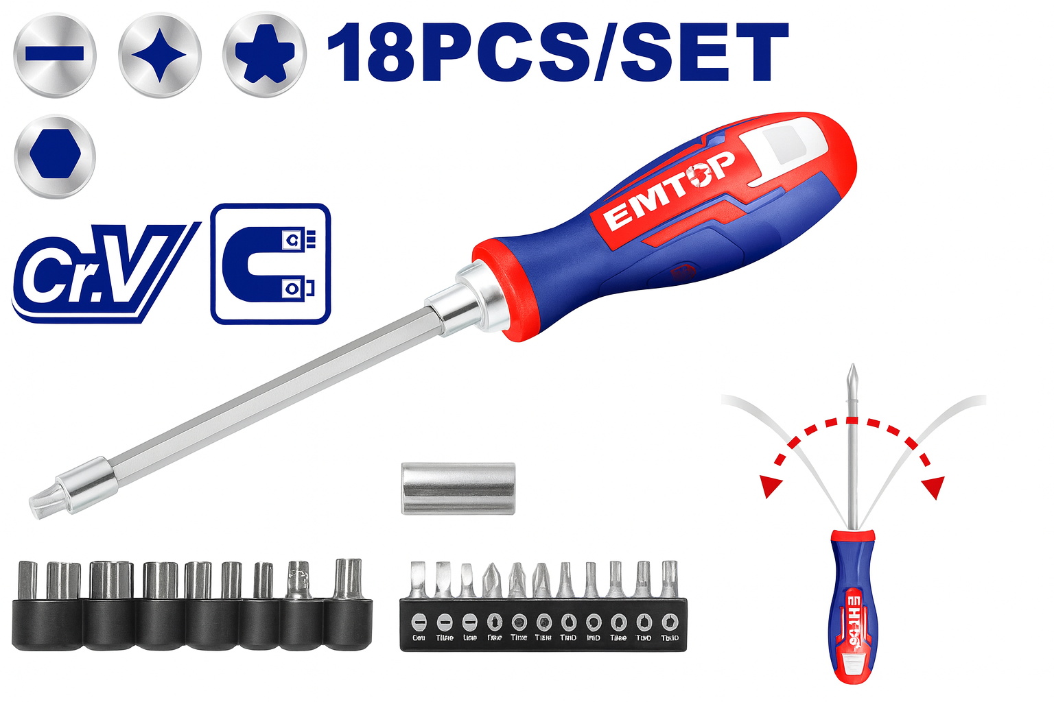 Juego de desarmador flexible de 18 piezas con copas y puntas intercambiables.