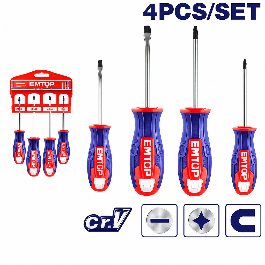 Juego de desarmadores plano y de cruz de 4 piezas Cr-V con mango ergonómico
