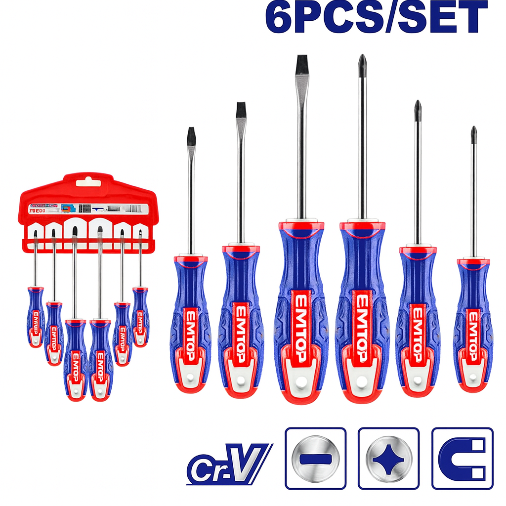 Juego profesional de 6 desarmadores (planos y de cruz) fabricados en acero cromo-vanadio (Cr-V), ideal para trabajos de mantenimiento, mecanica y electricidad. Su nuevo mango ergonómico ofrece un agarre cómodo y antideslizante, mientras que los vástagos redondos reforzados Garantizan resistencia y precisión durante el uso.