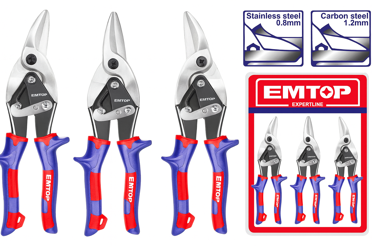 el juego de tijeras de aviacion EMTOP EASPK1011 Incluye tres modelos: corte izquierdo, corte recto y corte derecho, diseñados para brindar precisión, durabilidad y comodidad en trabajos de corte de lámina metálica, acero inoxidable, plástico o aluminio. Sus mangos ergonómicos de tres tonos aseguran un agarre firme y cómodo durante el uso prolongado.