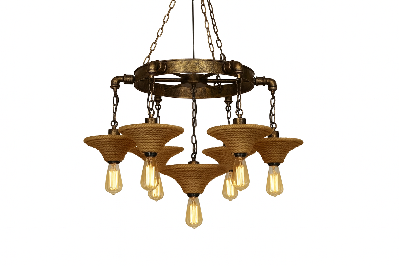 Lampara colgante LGYC40601116 / JY0124070002 combinar hierro negro con detalles dorado antiguo y cuerda de cáñamo natural, logrando un diseño rústico-industrial de alta calidad. Ideal para iluminar y decorar espacios amplios, ofrece una estética cálida, artesanal y elegante, perfecta para ambientes con carácter.