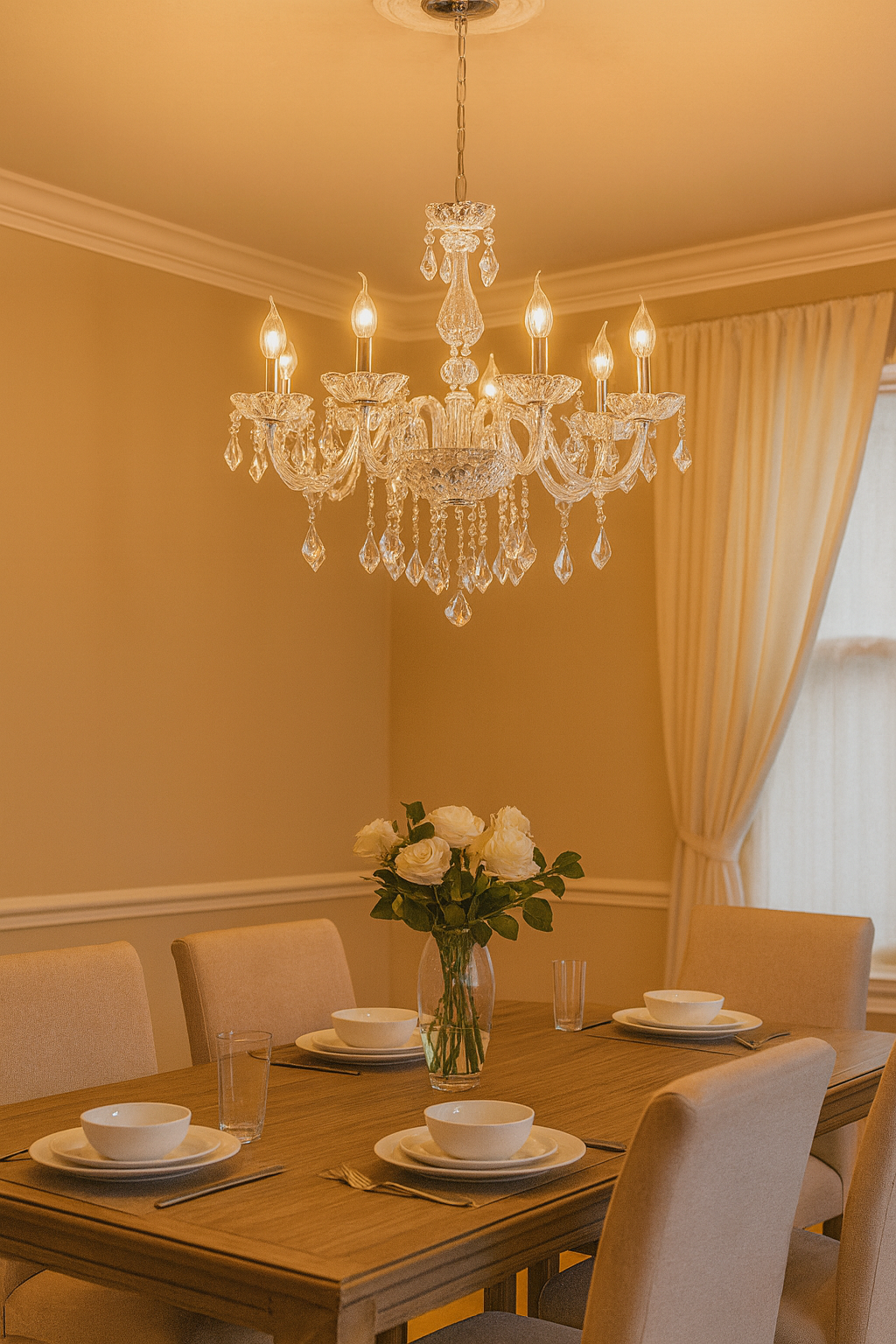 Equipada con casquillos E12, esta lámpara proporciona una Iluminación cálida, uniforme y envolvente., ideal para comedores, salas, hoteles o ambientes residenciales que buscan elegancia y estilo refinado.