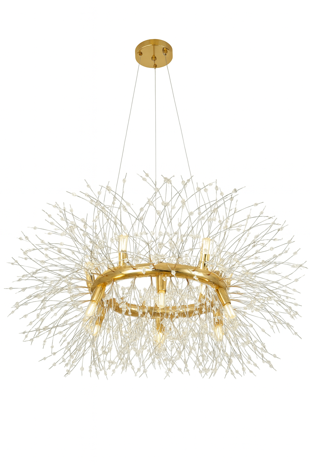 la lámpara de cristal LG-MY41119096 es una pieza de lujo que combina Diseño moderno, materiales de alta calidad y un acabado dorado impecable.. Su estructura circular de 600 mm de diámetro, fabricado en hierro y cristal, se realza con un elegante chapado dorado electroplateado, aportando brillo, calidez y exclusividad a cualquier ambiente.