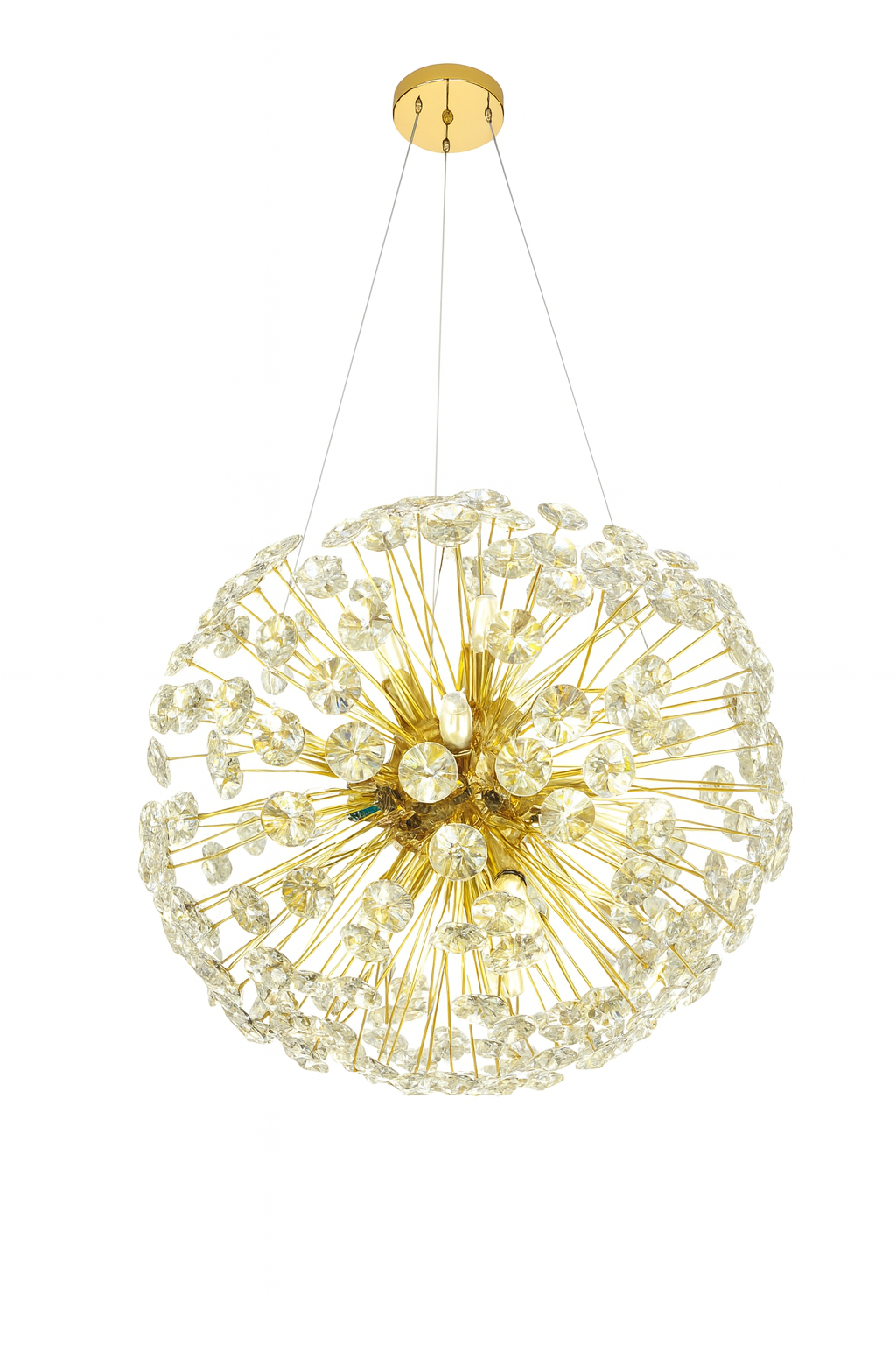 la lámpara de cristal LG-MY41119090 es una pieza decorativa de lujo que combina elegancia clasica y diseño moderno, ideal para espacios que buscan sofisticación y calidez. Fabricada en hierro y cristal, su estructura circular de 600 mm de diámetro presenta un hermoso acabado dorado chapado que aporta brillo, distinción y glamour.