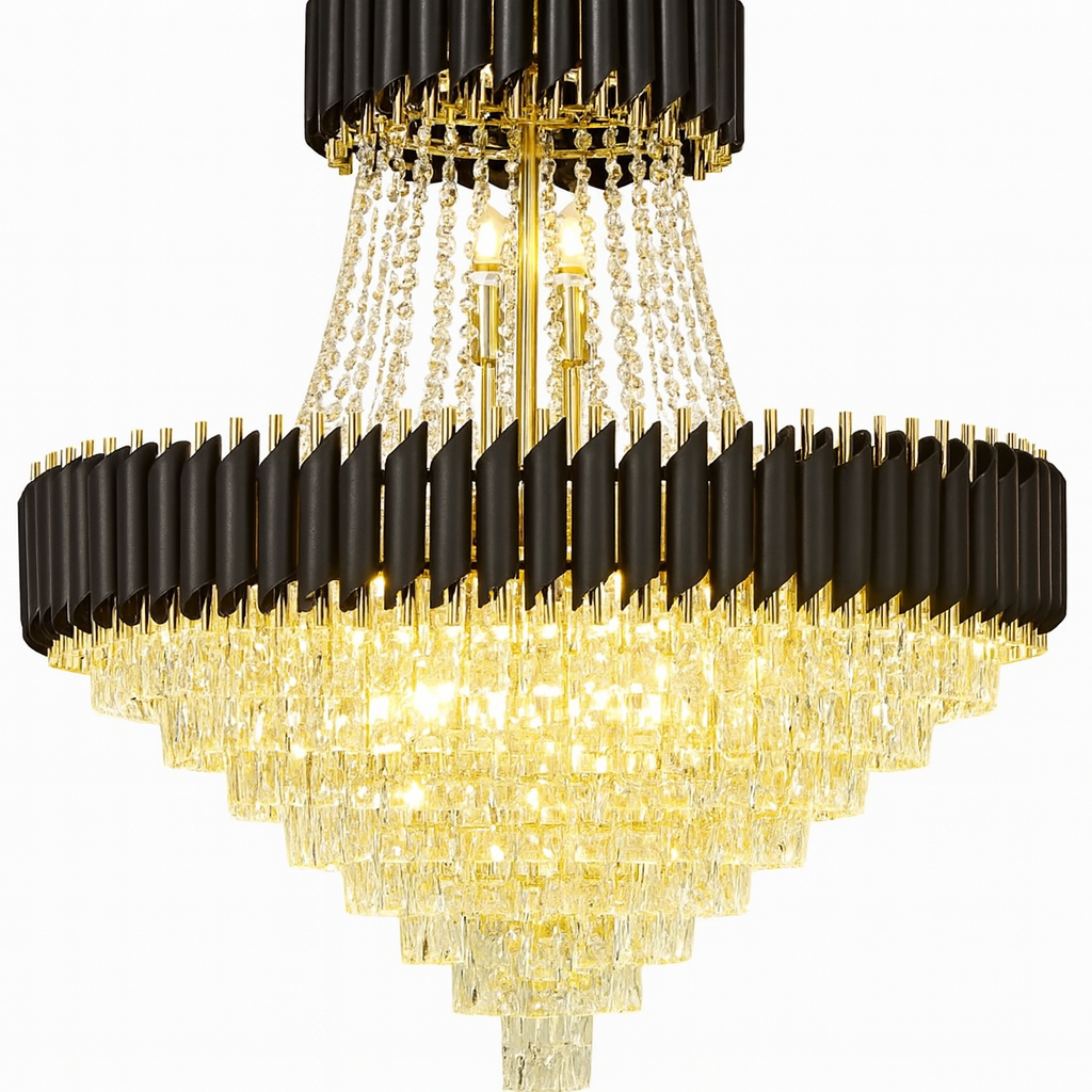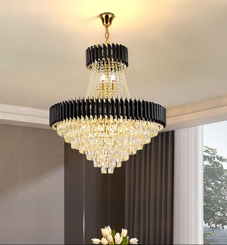 la lámpara de cristal de lujo LG-MY40801060 combinar Diseño contemporáneo, materiales de alta calidad y una estética sofisticada. que aporta elegancia a cualquier ambiente. Su estructura de Ø400 × Al.520 mm, fabricado en cristal y hierro con acabado negro pintado, se complementa con una base de techo dorada electroplateada, logrando un contraste visual moderno y distinguido.