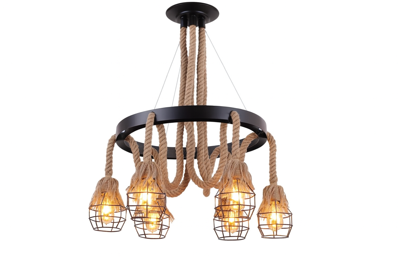 Lampara colgante LG-YC31001012 combina elegancia rústica y diseño industrial moderno. Su estructura de hierro con acabado negro y su aro decorado con cuerda de yute natural aportan textura, calidez y estilo artesanal a cualquier espacio interior.