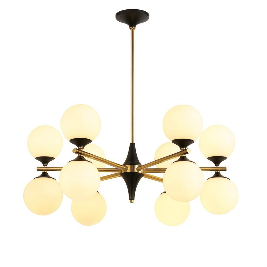 la lámpara LED colgante Y0124060103 combina elegancia moderna y diseño funcional con una estructura de hierro negro y pantallas de vidrio blanco lechoso. Su composición de 12 cabezales Distribuye la luz de manera uniforme, aportando un estilo contemporáneo ideal para comedores, salas o espacios amplios con decoración moderna.