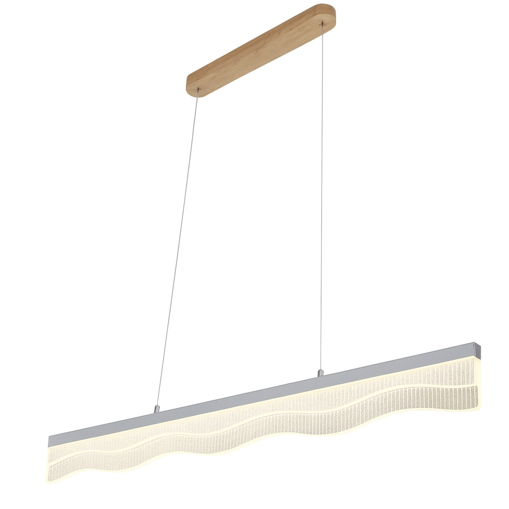 la lámpara LED decorativa de techo T0324090019 presenta un diseño moderno y estilizado con un acabado beige y detalles dorados, ideal para ambientes elegantes y contemporáneos. Su estructura alargada ofrece una iluminación amplia y equilibrada, perfecta para comedores, salas, barras u oficinas modernas.