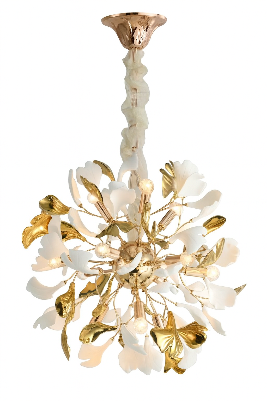 la lámpara LED decorativa de techo O0124080016 es una pieza de lujo con un diseño espectacular que combina arte y funcionalidad. Su estructura dorada y sus 54 colgantes de cerámica Crea un efecto visual elegante y refinado, ideal para espacios amplios con decoración moderna o clásica de alto nivel.