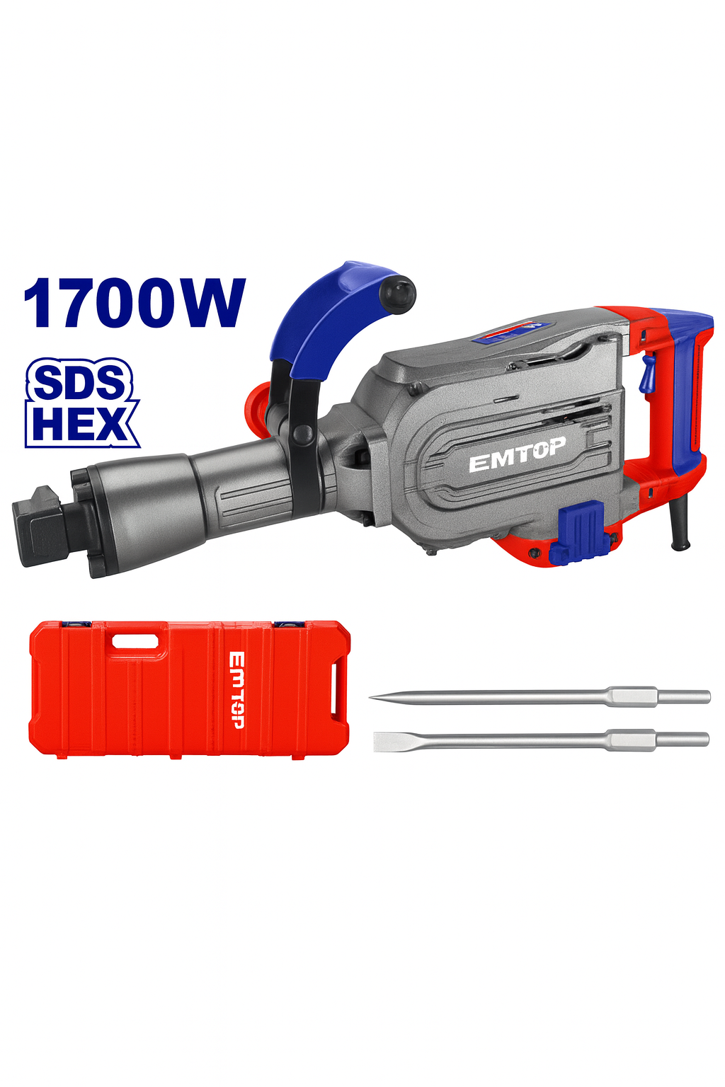 Martillo demoledor de alta potencia (1700W), ideal para demoliciones pesadas en concreto, piedra y superficies duras. Su potente mecanismo de impacto de 45 julios y frecuencia de 1400 golpes por minuto (bpm) Garantiza una máxima eficiencia en tareas exigentes. incorpora sistema de encastre HEX para un cambio rápido y seguro de los cinceles, y está diseñado con materiales resistentes que aseguran una larga vida útil.