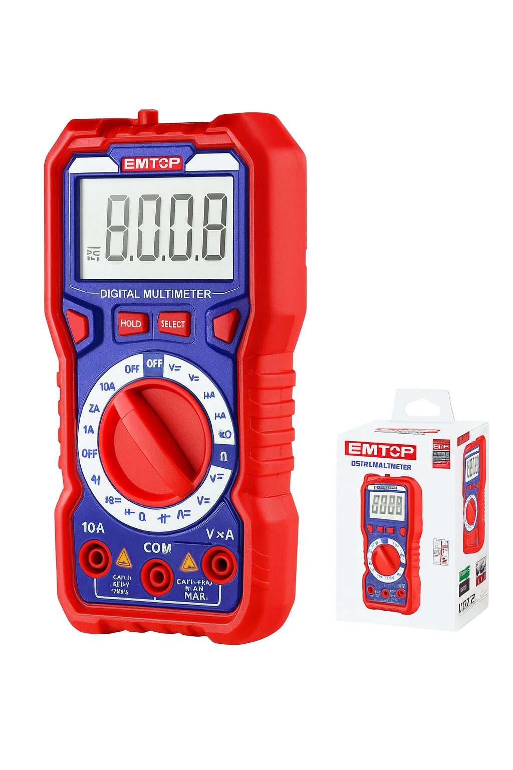 Multímetro digital EMTOP 2000 cuentas con pantalla LCD y medición de voltaje, corriente y resistencia