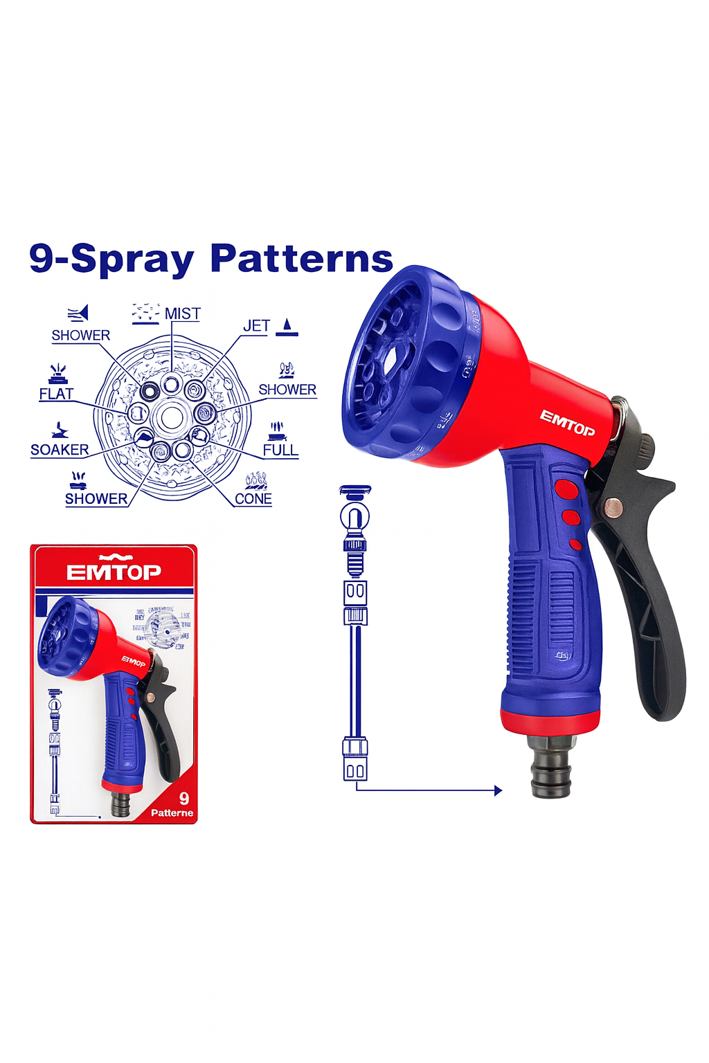 Pistola para Manguera de Agua 9 Funciones – ESNE10901 (Boquilla Plástica con Mango Suave y Palanca de Nylon)