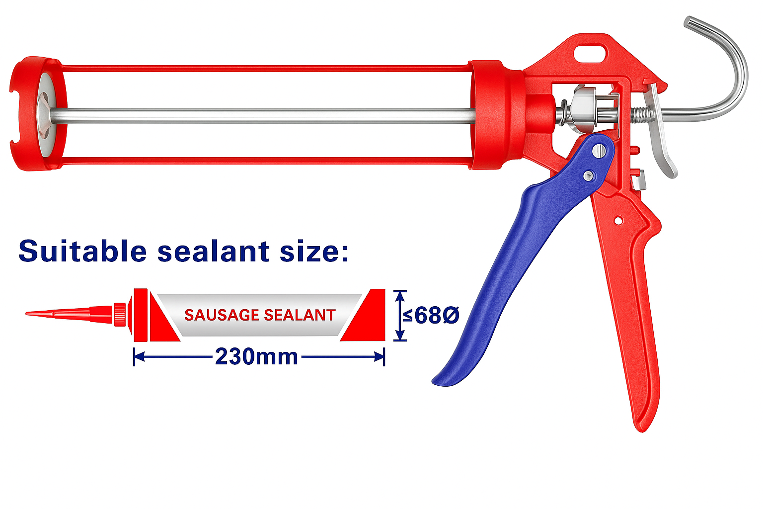 Pistola aplicadora de silicona de 9 pulgadas (230 mm), diseñado para sellado y aplicación uniforme de siliconas, adhesivos y selladores. Su mango de aluminio resistente y su función giratoria permiten mayor control y comodidad durante el uso. la varilla lisa de 8 mm garantiza una presión constante y un flujo suave del material.