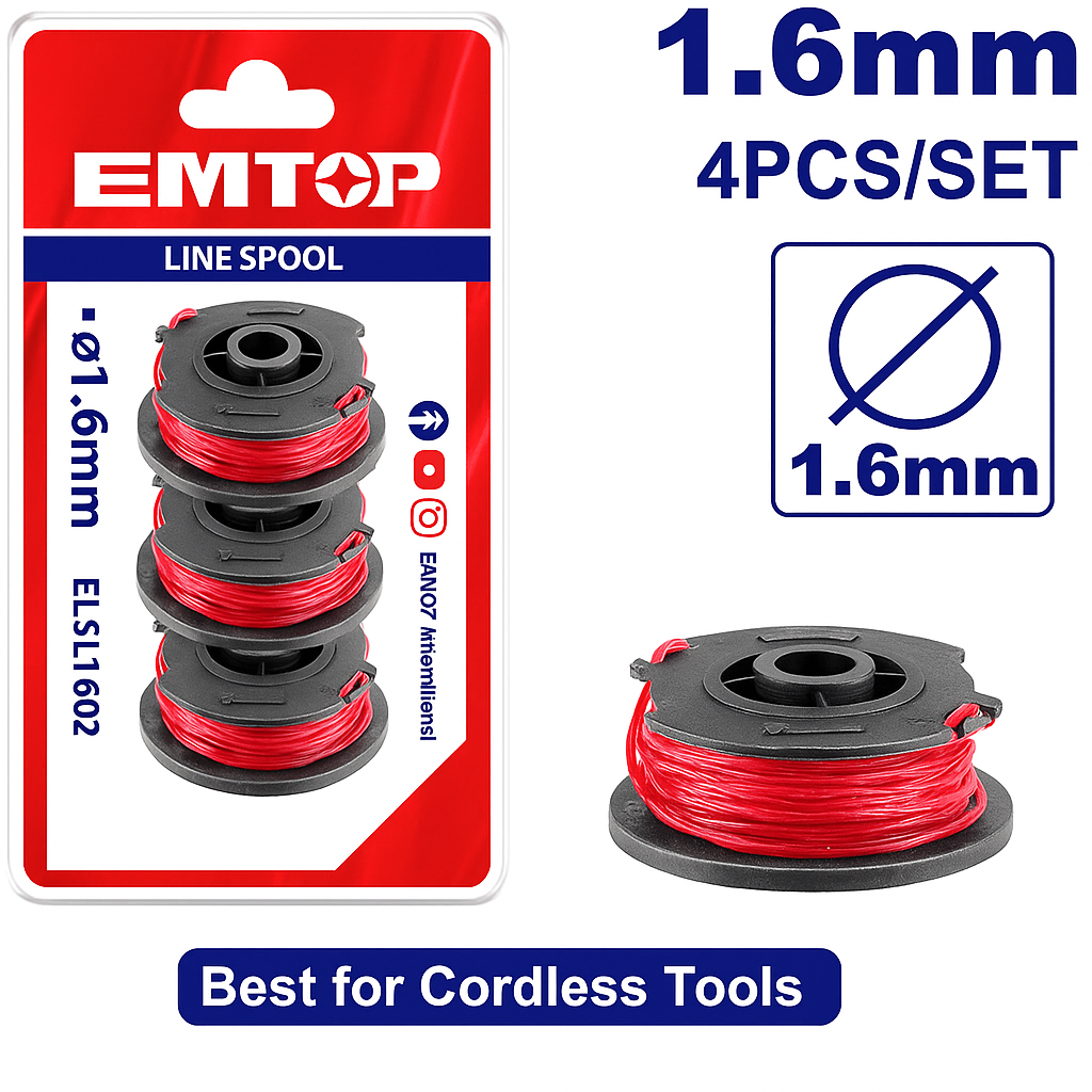 el set de carretes de hilo EMTOP ELSL1602 está diseñado para desbrozadoras y cortadoras de césped a batería, ofreciendo Corte eficiente, limpio y duradero. gracias a su Línea espiral de 1,6 mm de grosor.. Cada carrete viene preinscrito y listo para usar, garantizando un reemplazo rápido y sin complicaciones.