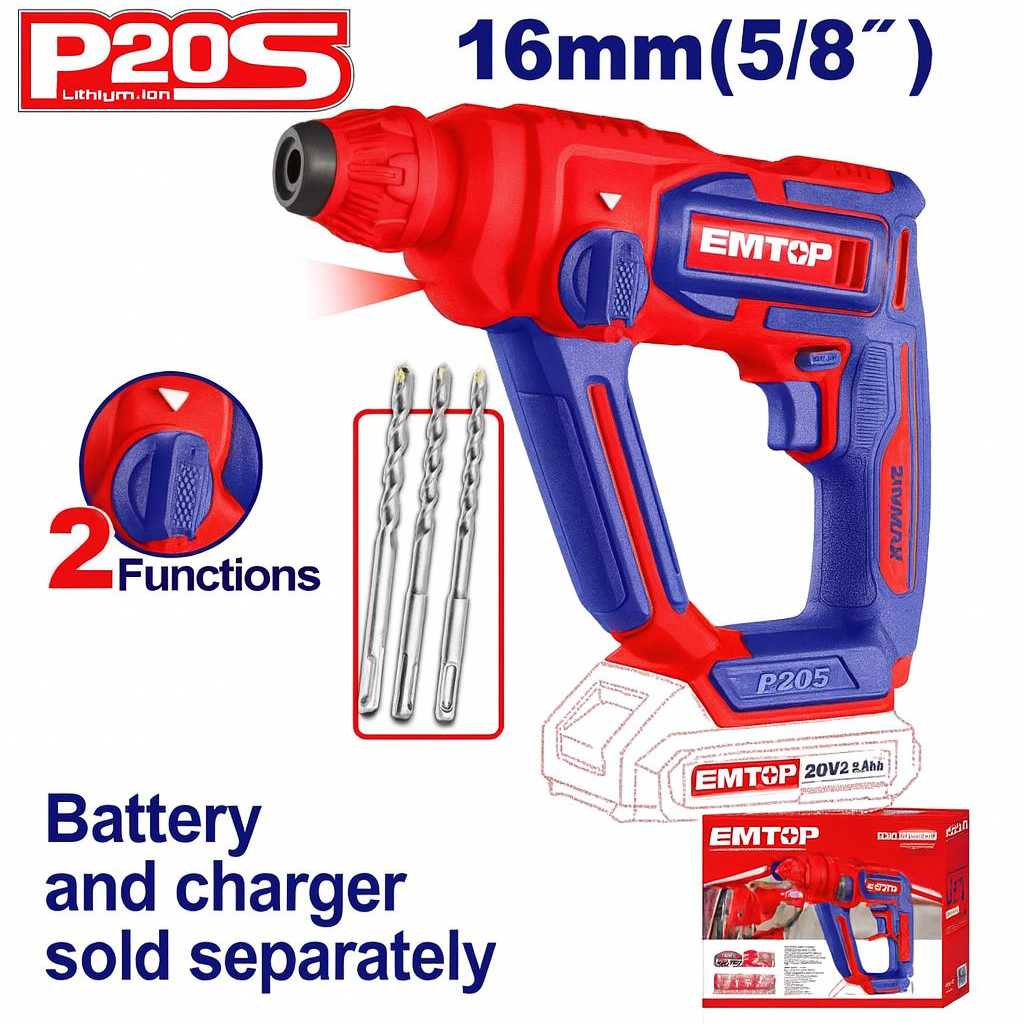 el rotomartillo inalambrico ELRH20168 ofrece potencia, movilidad y rendimiento profesional para trabajos de perforación en concreto, madera o acero. Equipado con un motor de 20V, alcanza una velocidad sin carga de 0–850 rpm, una tasa de impacto de 5100 bpm y una energía de impacto de 1.5J, lo que garantiza perforaciones rápidas y precisas.