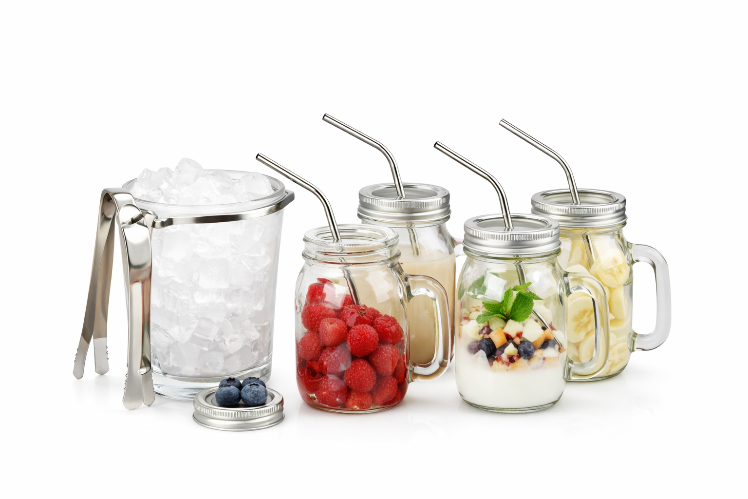 Dale un toque elegante y práctico a tu cocina con este set de taza y cubeta de vidrio de 5 piezas, ideal para preparar, servir y disfrutar tus bebidas o alimentos 🤍