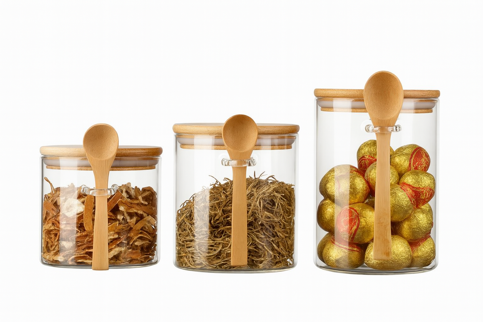 el vidrio grueso y transparente permite ver el contenido fácilmente, mientras que la tapa de bambú con sello de silicona hermético asegura un cierre firme, protegiendo los productos de la humedad y conservando su frescura por más tiempo.