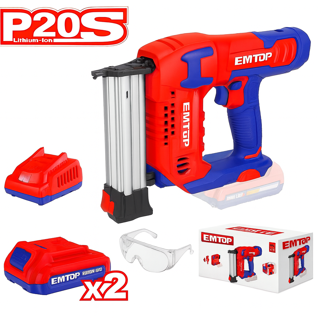 la clavadora inalámbrica EMTOP UELBNLI3508 ofrece Potencia, precisión y autonomía profesional. para trabajos de carpintería, instalación, tapicería y molduras. Con una velocidad de disparo de hasta 3 clavos por segundo, permite un trabajo rápido y eficiente sin necesidad de compresor. Incluye 2 baterías de 20V 2.0Ah, ONU cargador EMTOP UEFCR20200 y gafas protectoras, todo listo para usar.