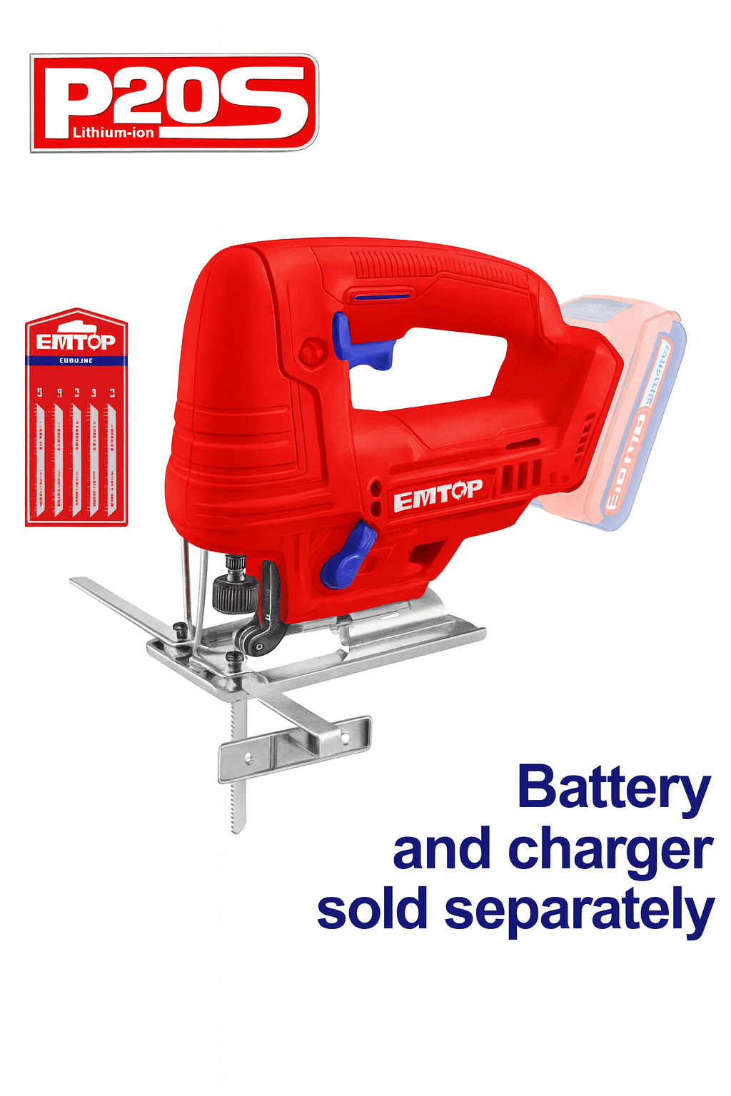 Sierra caladora inalámbrica EMTOP 20V con 5 hojas incluidas (capacidad de corte: madera 65 mm / metal 8 mm)