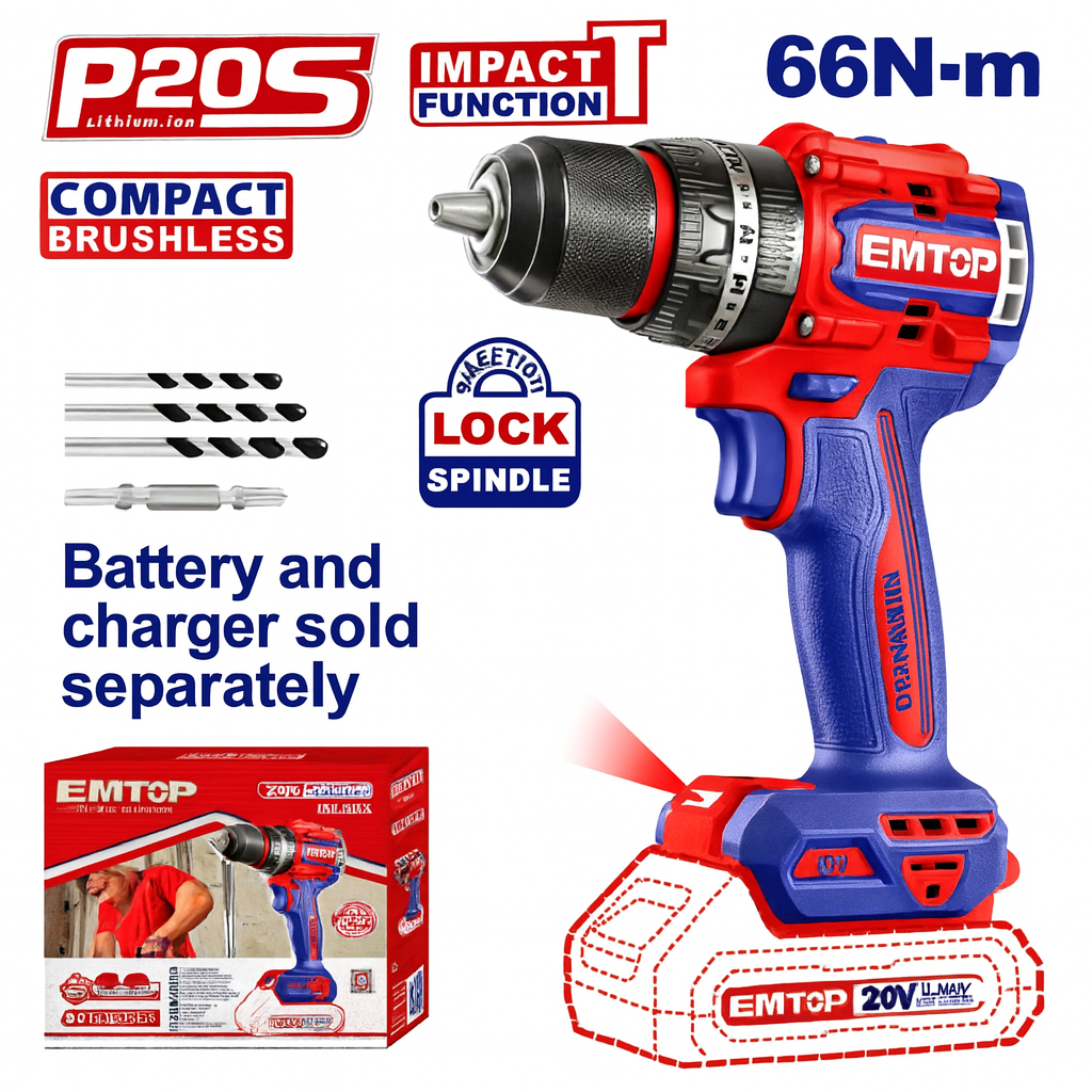 el taladro percutor inalámbrico EMTOP ECIDL205581 combinar potencia, tecnología avanzada y diseño compacto para ofrecer un rendimiento profesional en cualquier entorno. Equipado con un motor sin escobillas (brushless), garantiza Mayor eficiencia, menor desgaste y una vida útil más prolongada.. Con su par máximo de 55 Nm, su frecuencia de impacto de hasta 30.000 bpm y su mandril metalico de 13 mm, es ideal para trabajos de perforación, atornillado y percusión en madera, metal y mampostería.