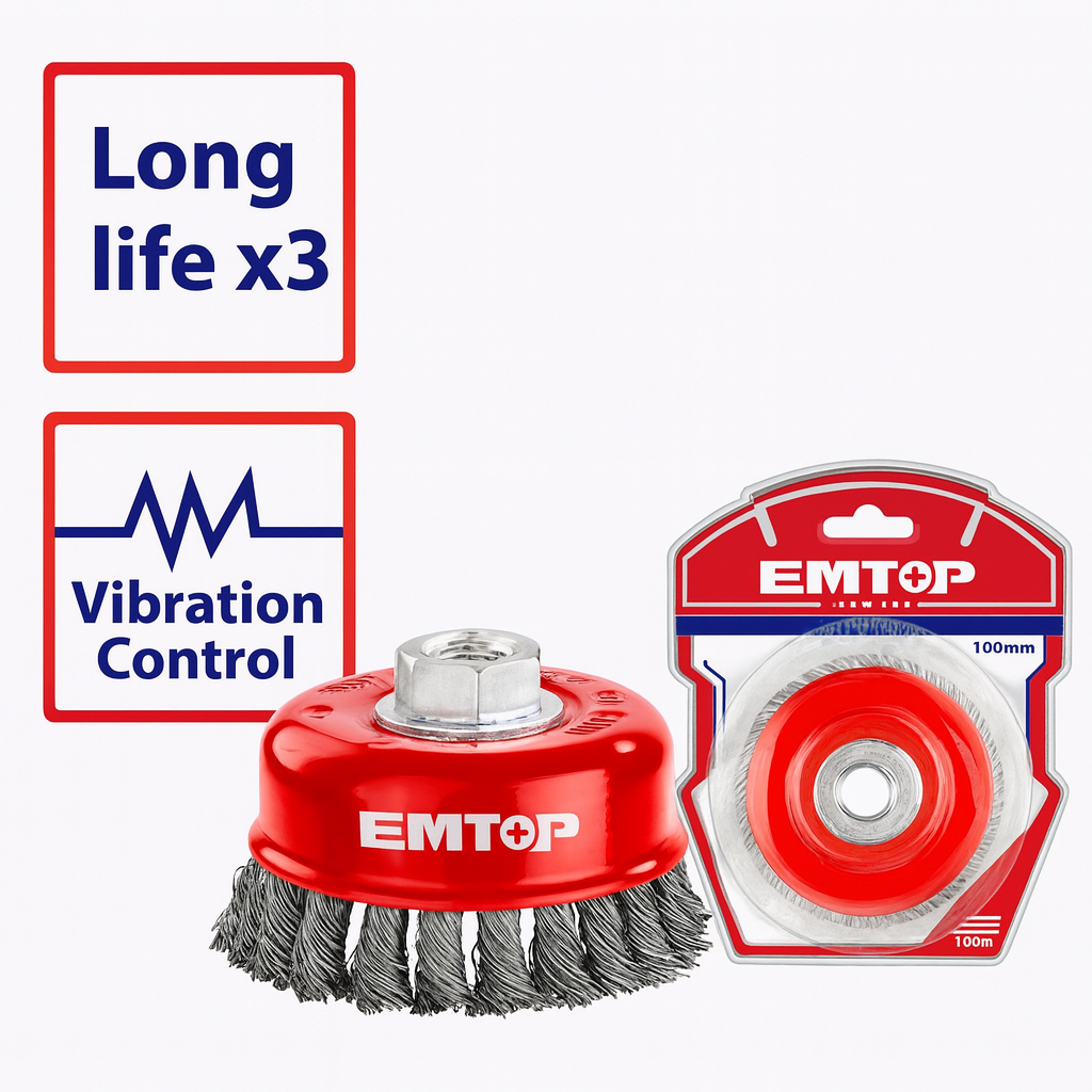 Elimine óxido y pintura con fuerza y eficiencia profesional con el cepillo de copa EMTOP de 0,5 mm.