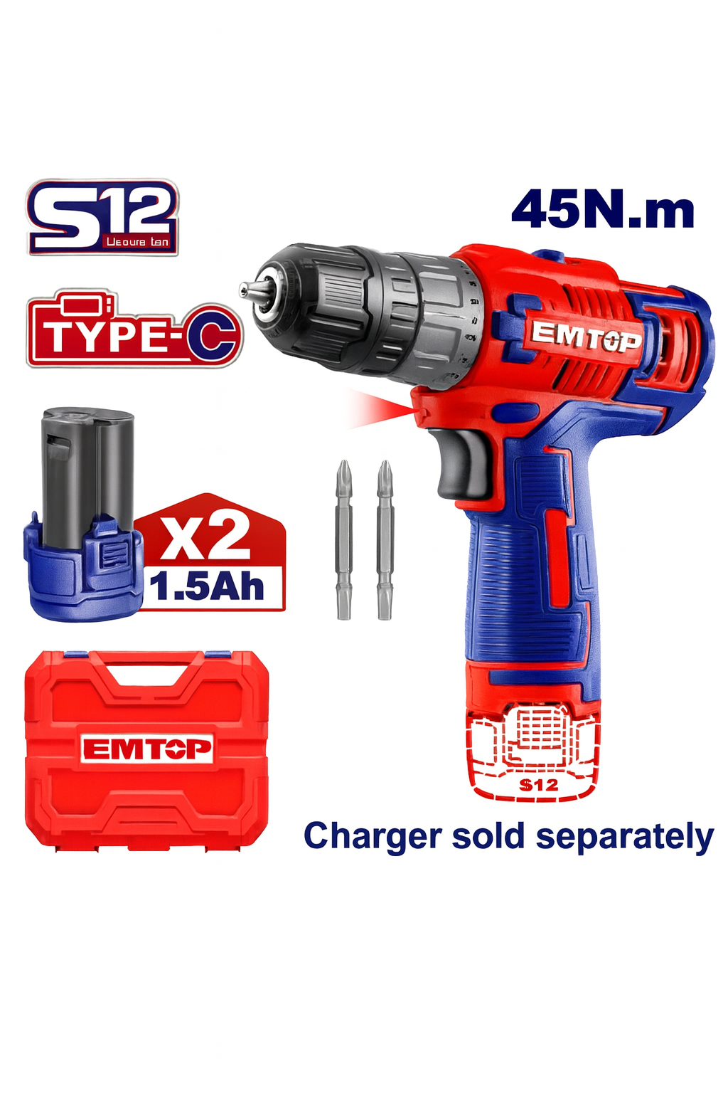 Taladro inalámbrico EMTOP 12V con 2 velocidades mecánicas, luz LED y 2 baterías de 1.5Ah (USB-C)