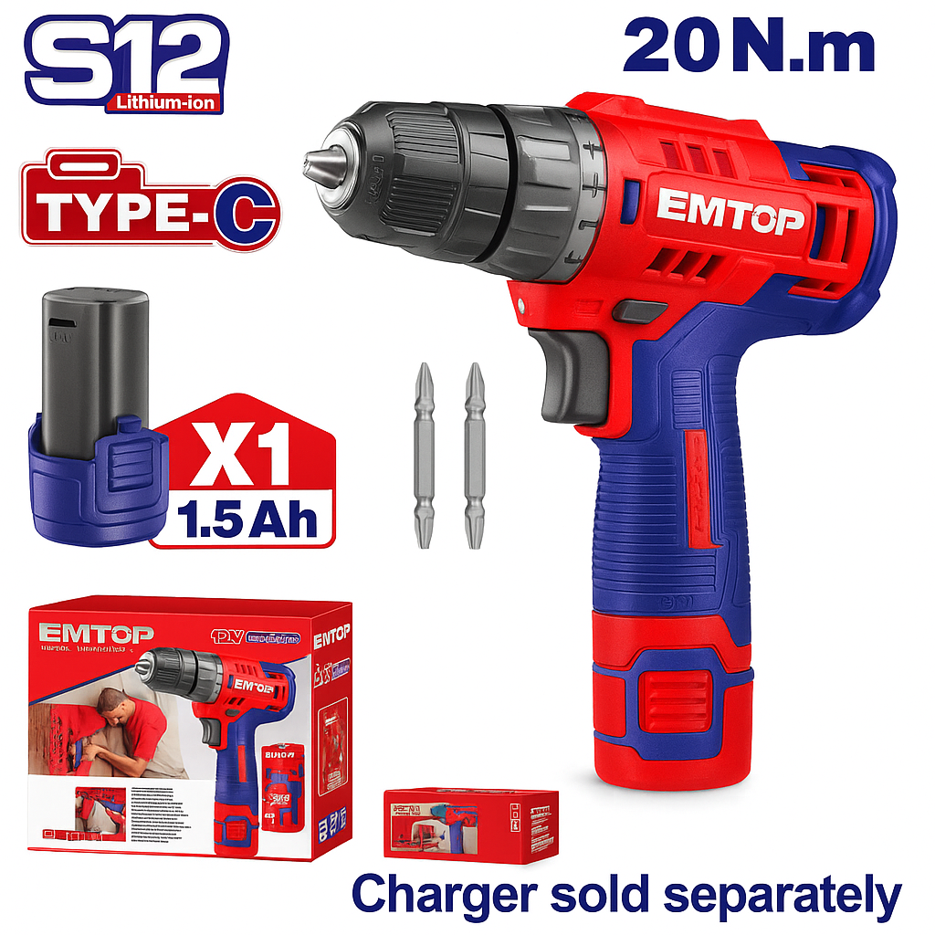 Taladro inalámbrico EMTOP 12V con luz LED, batería 1.5Ah y puerto de carga USB-C